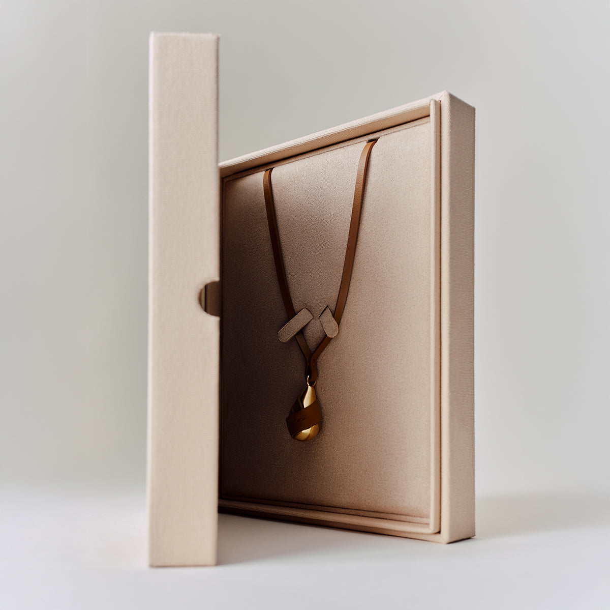 The Ormé necklace sees a leather string wrapping around the neck in celebration of artisanal leatherwork. A metallic droplet, enveloped in a strip of leather, falls delicately at the top of the chest.